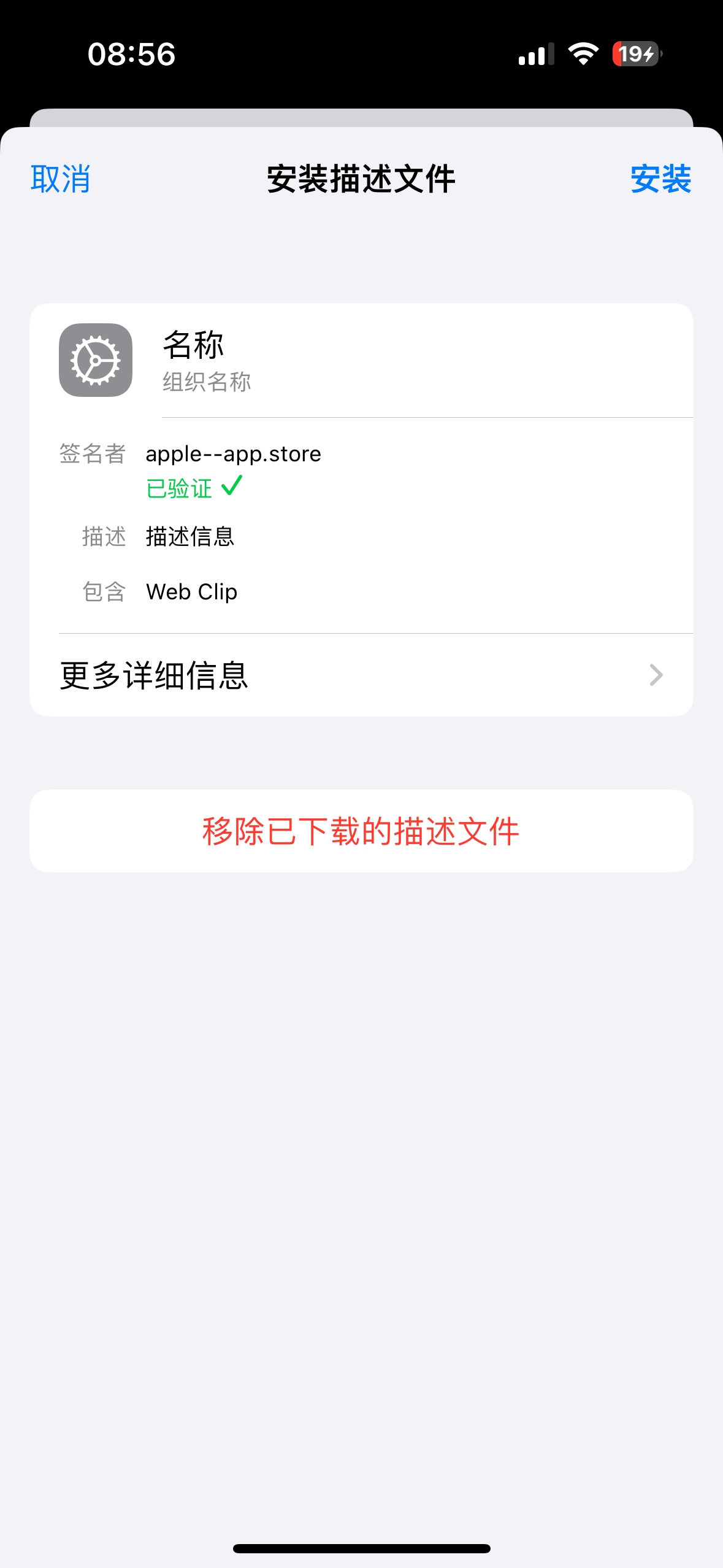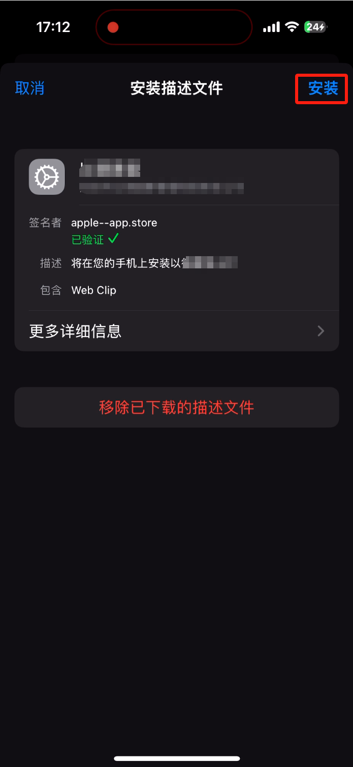 进入手机设置,点已下载描述文件,弹出安装界面,点击安装即可。