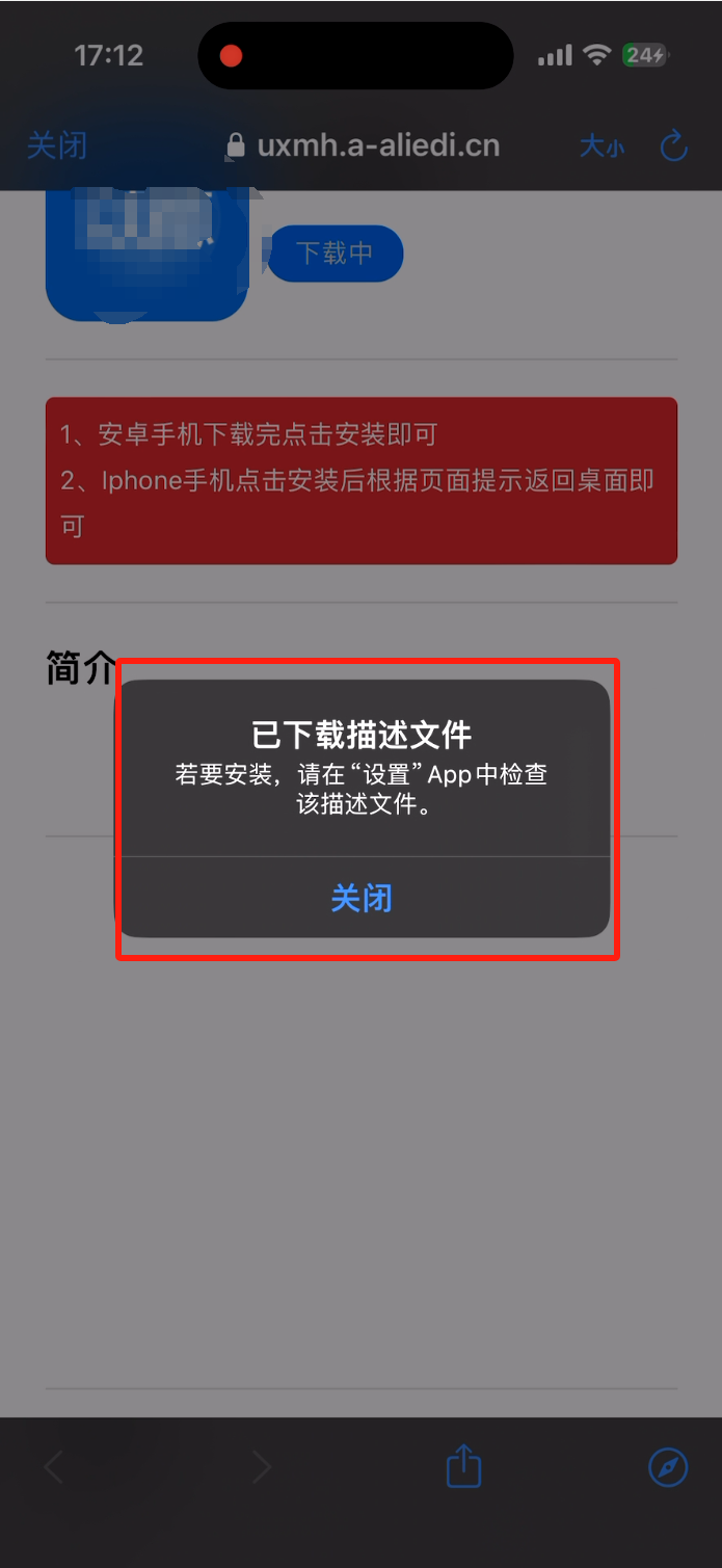 用苹果自带的扫码器扫码,进入网址下载文件,弹出下载完成后进入手机设置