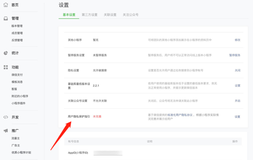 解绑平台,在小程序管理【小程序管理后台】-【设置】-【基本设置】-【用户隐私保护指引】中设置当前线上版小程序收集和使用的用户个人信息,包括:1)通过调用微信接口收集的用户个人信息;2)由用户主动填写并由开发者收集的用户个人信息。