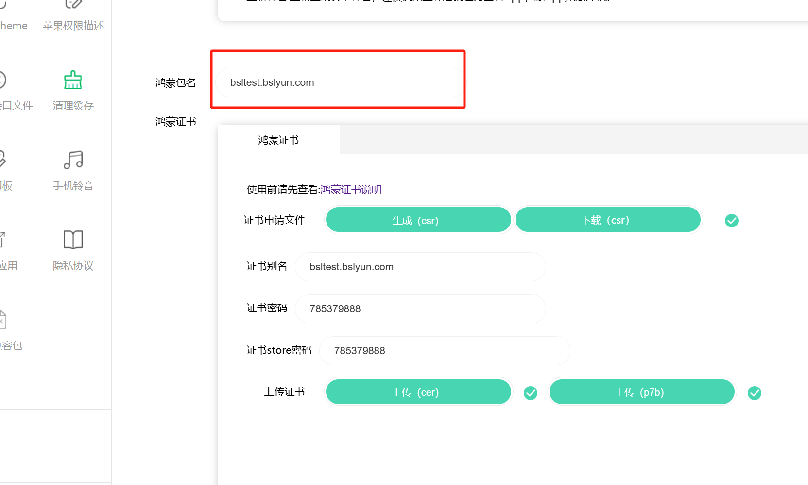 在APP配置页面,点击证书,在右侧找到鸿蒙证书配置的部分